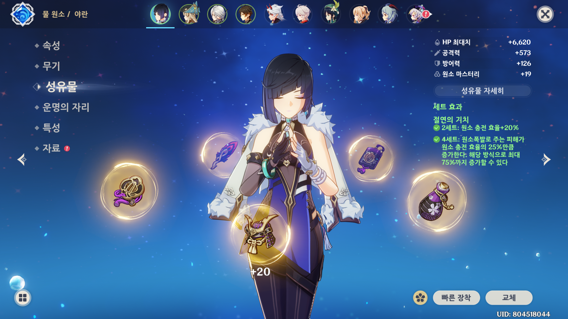 야란은 물 원소 캐릭터이기 때문에 번개, 불과 시너지가 잘 맞습니다.