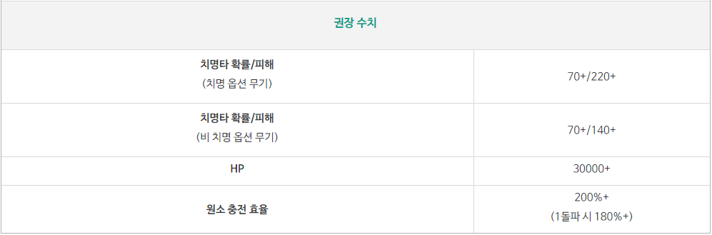 위와 같이 성유물을 장착하였을 때 권장 수치는 아래와 같습니다.