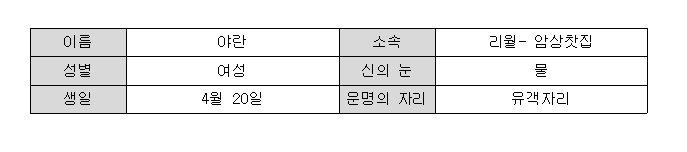 야란은 리월에 소속된 물 원소 속성을 가진 캐릭터입니다.