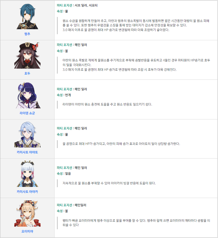저는 서포터로 카즈하와 나히다를 사용하고, 메인 딜러는 불 원소 캐릭터를 사용합니다.